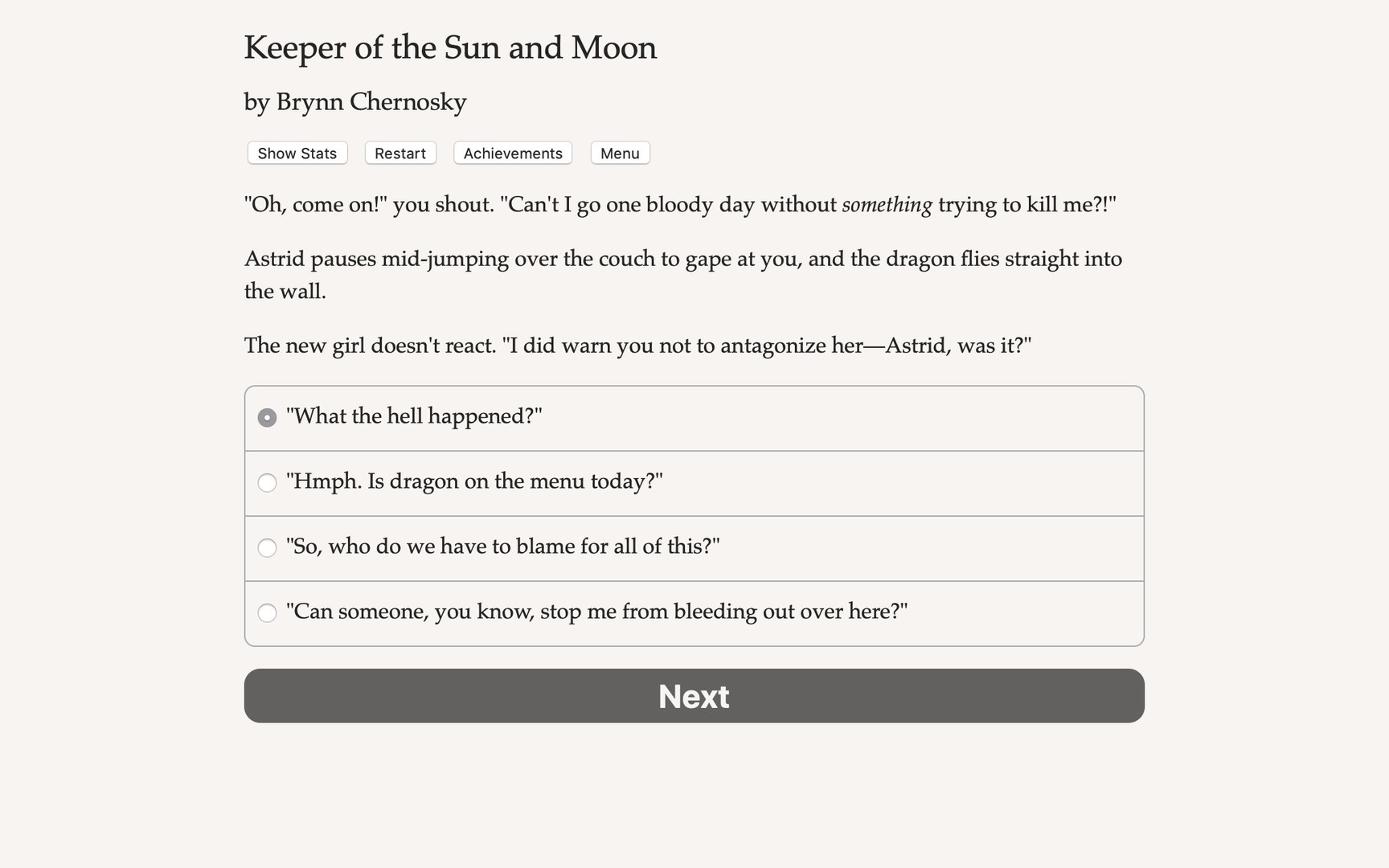 《太阳与月亮的守护者》是布琳·切诺斯基创作的310,000字互动式奇幻小说,你的选择将推动故事发展。这是一款完全基于文本的游戏——没有图形或音效,并由你无边的想象力驱动。